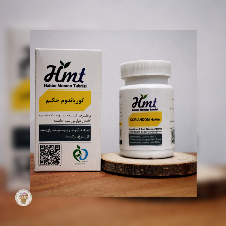 قرص کوریاندوم حکیم مومن تبریزی حاوی برگ سنا و گل سرخ بوده که از گیاهان معروف برای درمان یبوست هستند و هم چنین زیره سیاه و رازیانه که در ترکیبات این قرص به کار رفته است. این محصول به بهبود سوء هاضمه که دلیل مشخصی نیز ندارد و نشانه هایی چون درد بالای شکم، نفخ، حالت تهوع دارد، کمک می کند. گل سرخ که از ترکیبات این محصول است، به بهبود نفخ کمک می کند و به درمان اخلاط خونی و اسهال های شدید کمک می کند.